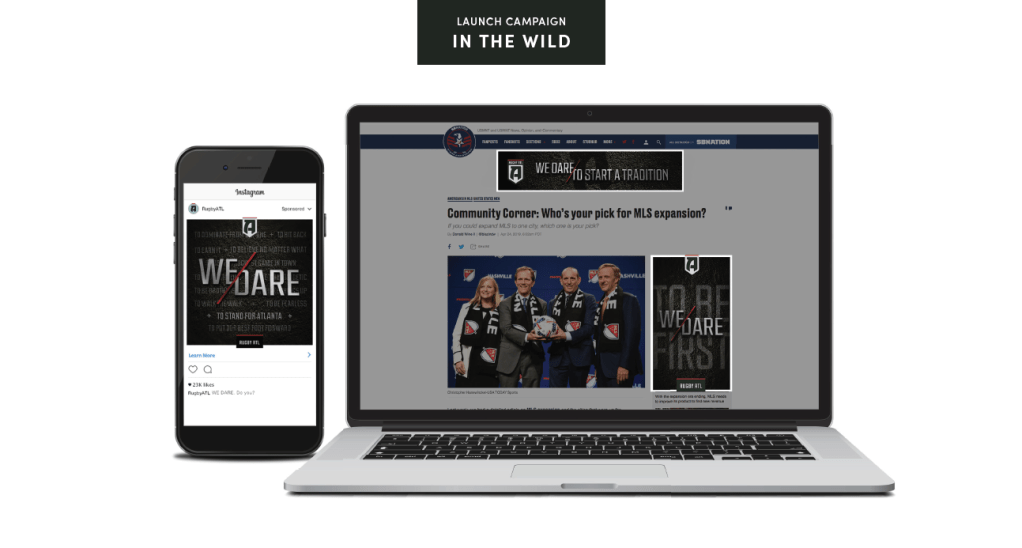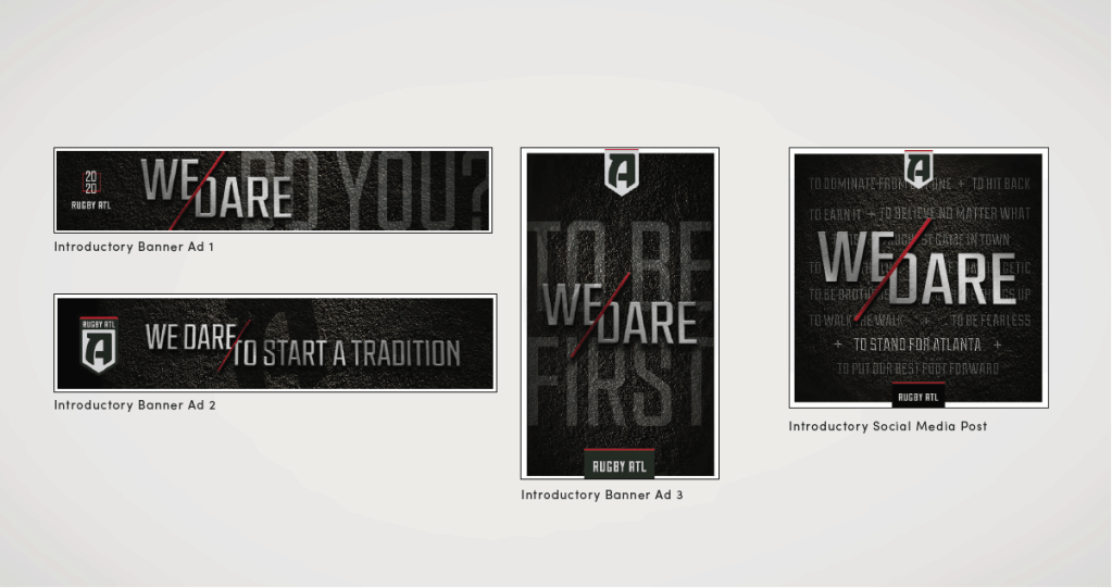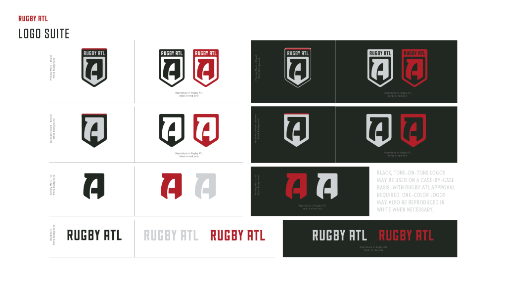 Identity exploration began by visualizing the brand’s personality traits through moodboards. For Rugby ATL, filters such as bold, gritty, and disruptive were defined. Through an iterative process, one mark emerged—a symbol both familiar to Atlanta sports fans and distinctive to a new community. The crest reflects the strength and brotherhood of the rugby world, while the heavyweight “A” stands out among a crowded field of existing icons.