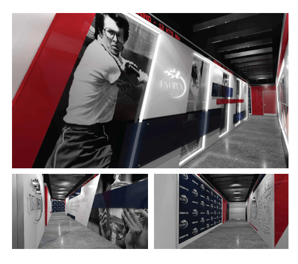 USTA and The U.S. Open presented an opportunity to revamp their player locker room and interview hallway at Arthur Ashe Stadium. The vision was to create sense of motion that conveyed the speed of a tennis match. This was accomplished with long horizontal colored acrylic panels and angled floor to ceiling graphics. Inspirational images and quotes from former tennis champions adorn the locker room hallway as well as an autograph wall and interview backdrop to preserve future legacies.